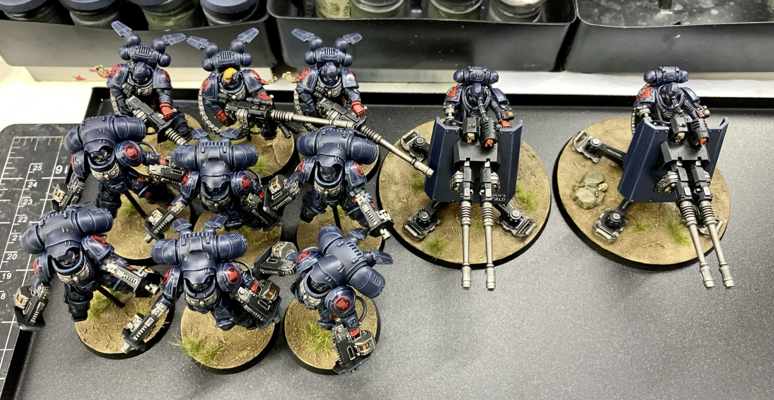 Finished all the grav chute guys that came with Dark Imperium/Know No Fear/Vanguard Space Marines, as well as the new turrets.