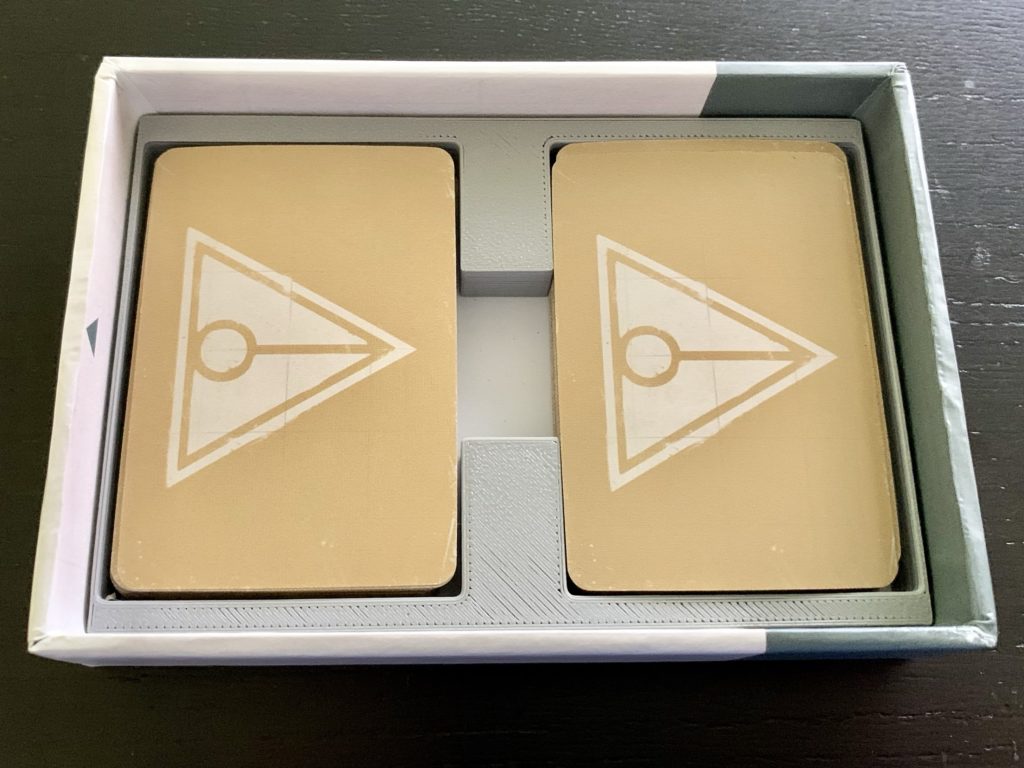 Speaking of cards: the card packs include some big cards but also some little cards. I didn’t like how the little cards would sort of float around in the bottom of the box, so I made a little tray divider.