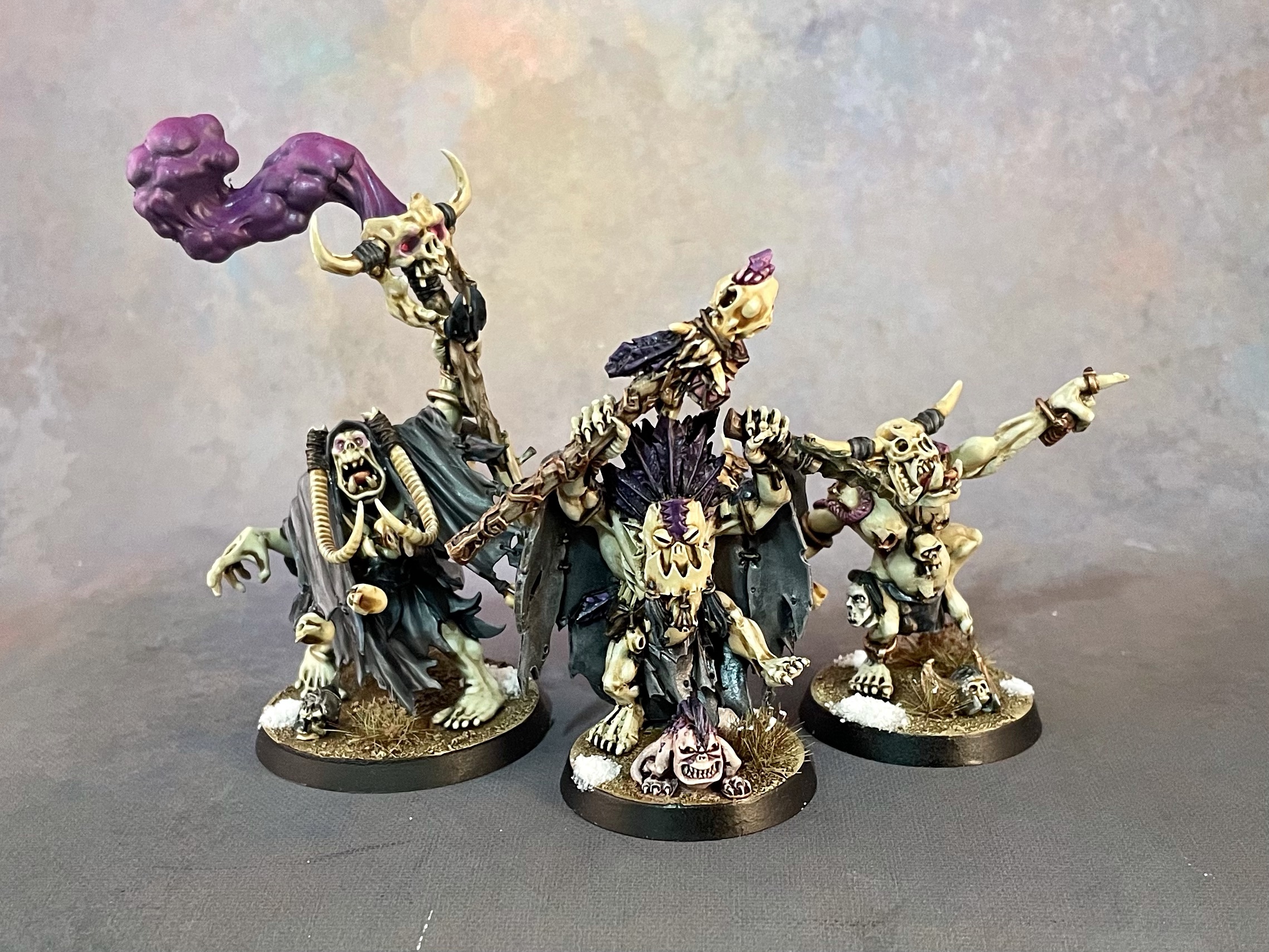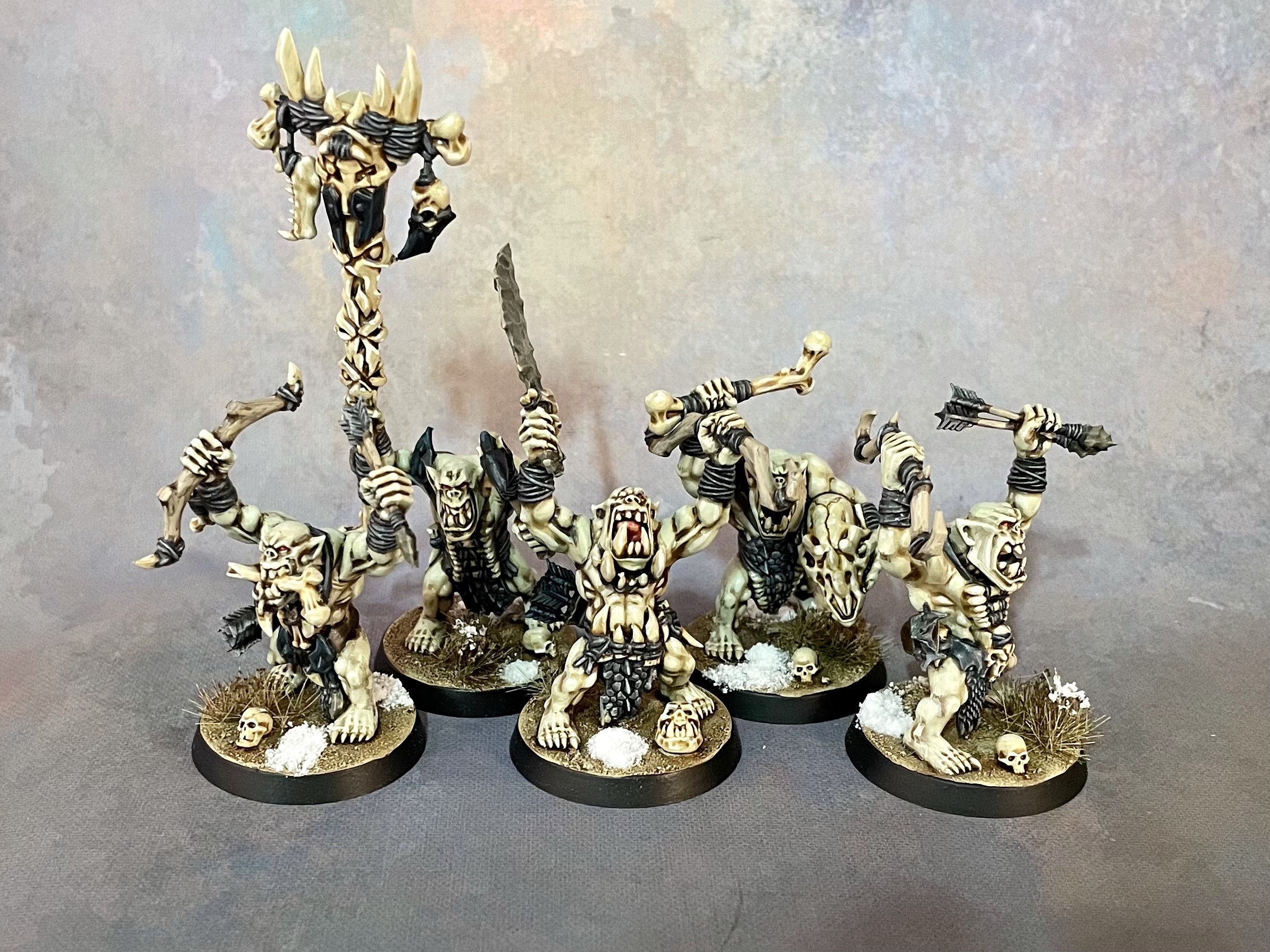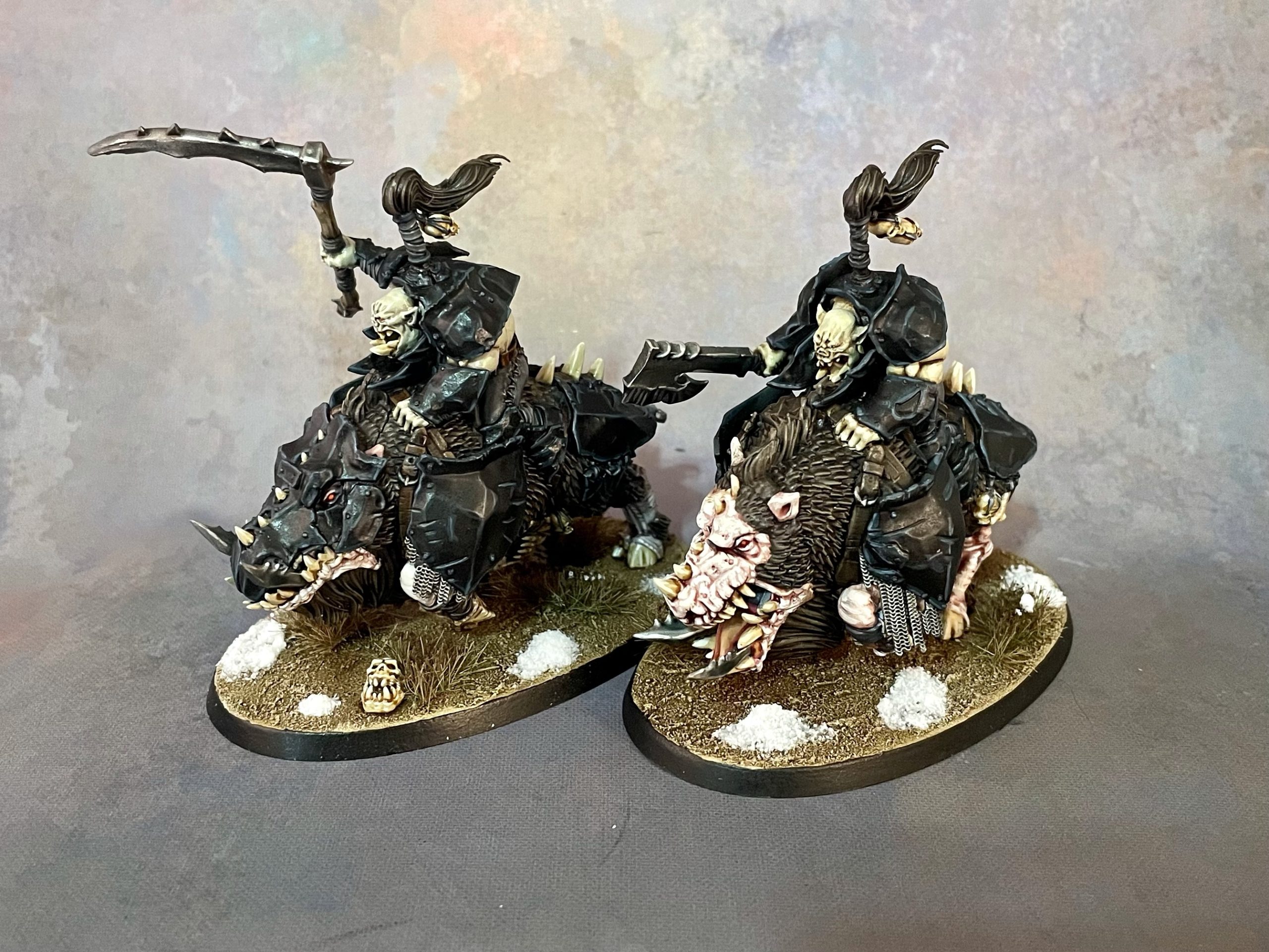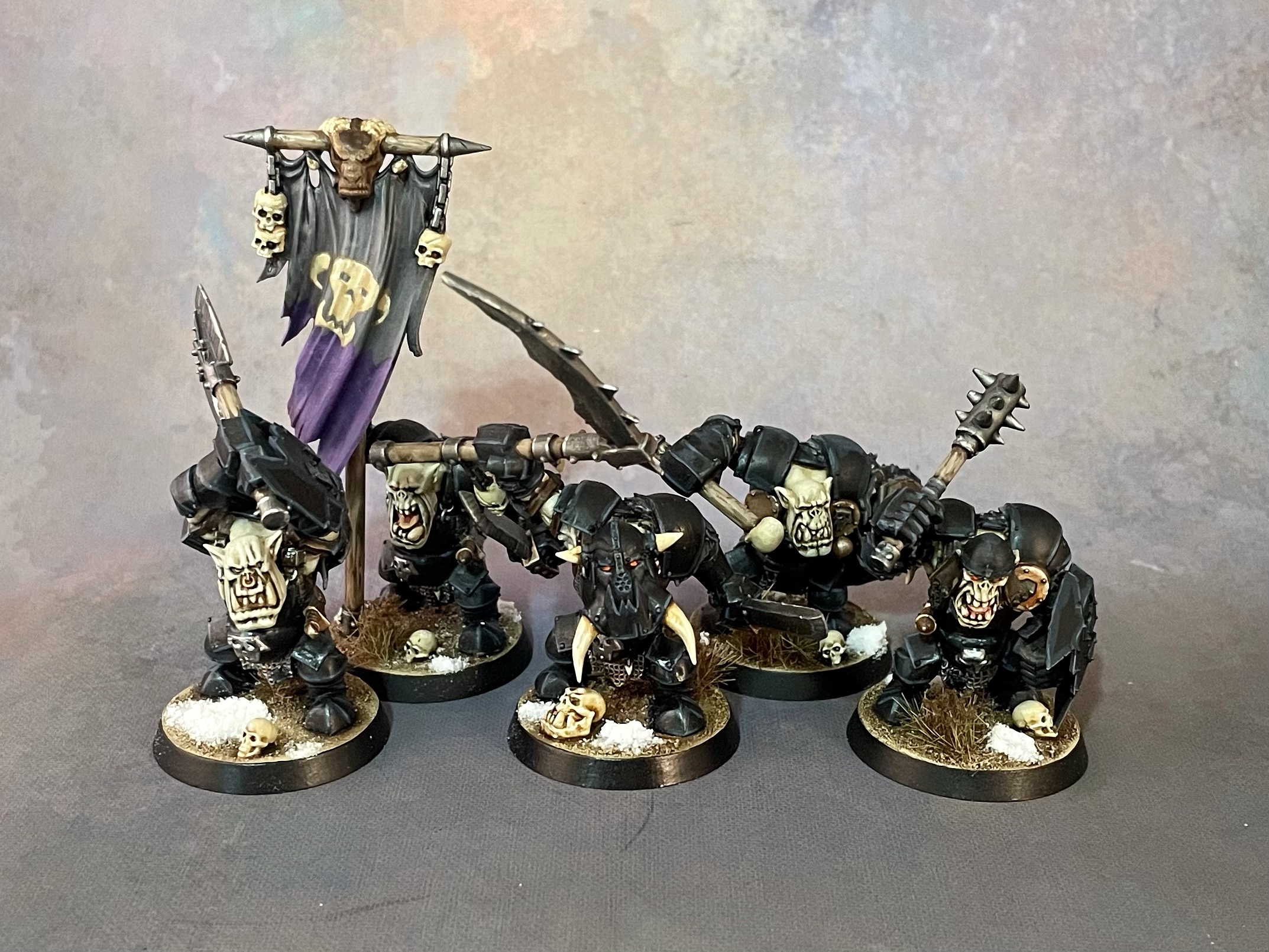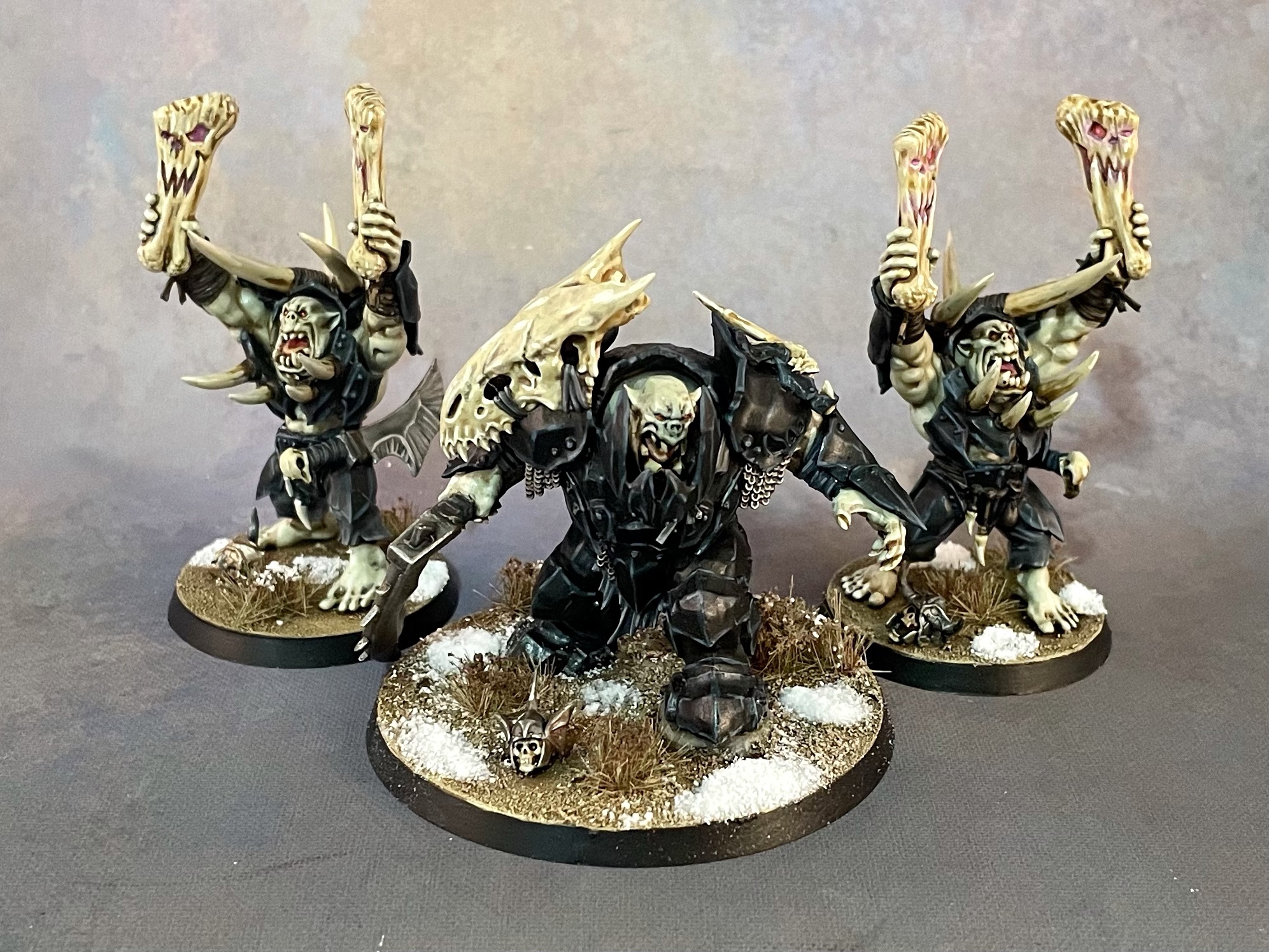 I wanted to go for a pale, albino orcish flesh, and settled on bluish black to contrast it. Because the point of the thing is that flesh, I had to track down some extra heads so my Ardboyz could be helmet-less (and my champions helmeted) instead of the other way around. I also commissioned someone to design an orc-y scythe head I could print to use on champions and heroes.