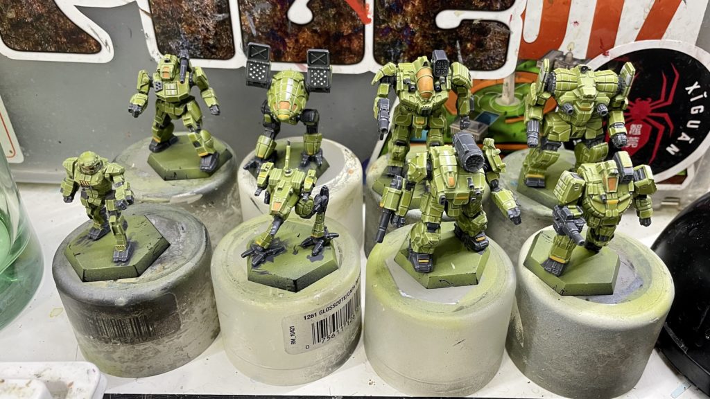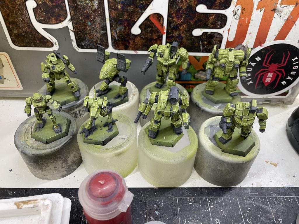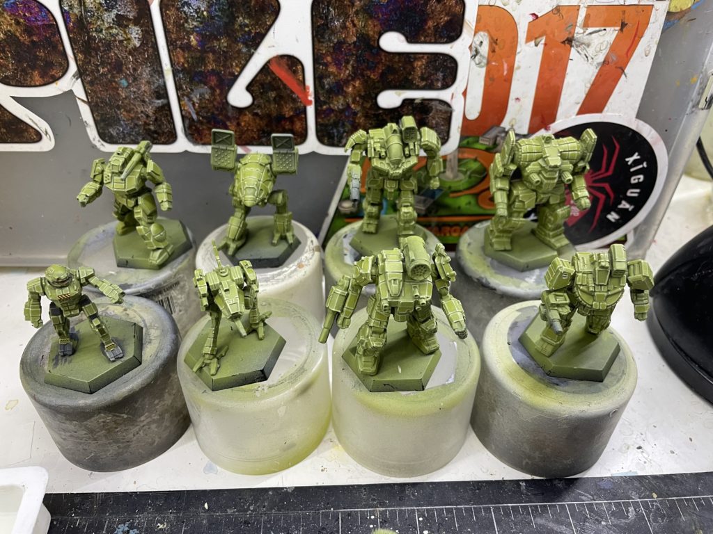 Spent this weekend working on some Battletech. Starting with 8 was, in retrospect, a mistake: too large of a batch… but it’s the contents of the starter A Game of Armored Combat box, so it did feel like the right way to tackle it.